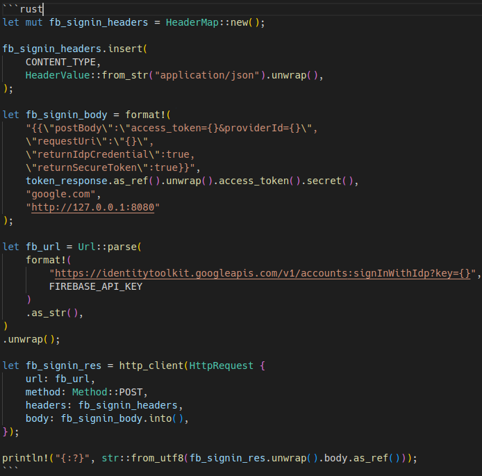 This bit of code uses the Firebase IdToken to retrieve data from firestore, according to the firestore rules (non-authed requests error out correctly). I need to do some research into how to effectively navigate nested JSON in Rust, or maybe just write some helper functions. I haven't even looked at learning macros yet, maybe they'll help? I'll cross that bridge when I come to it.
